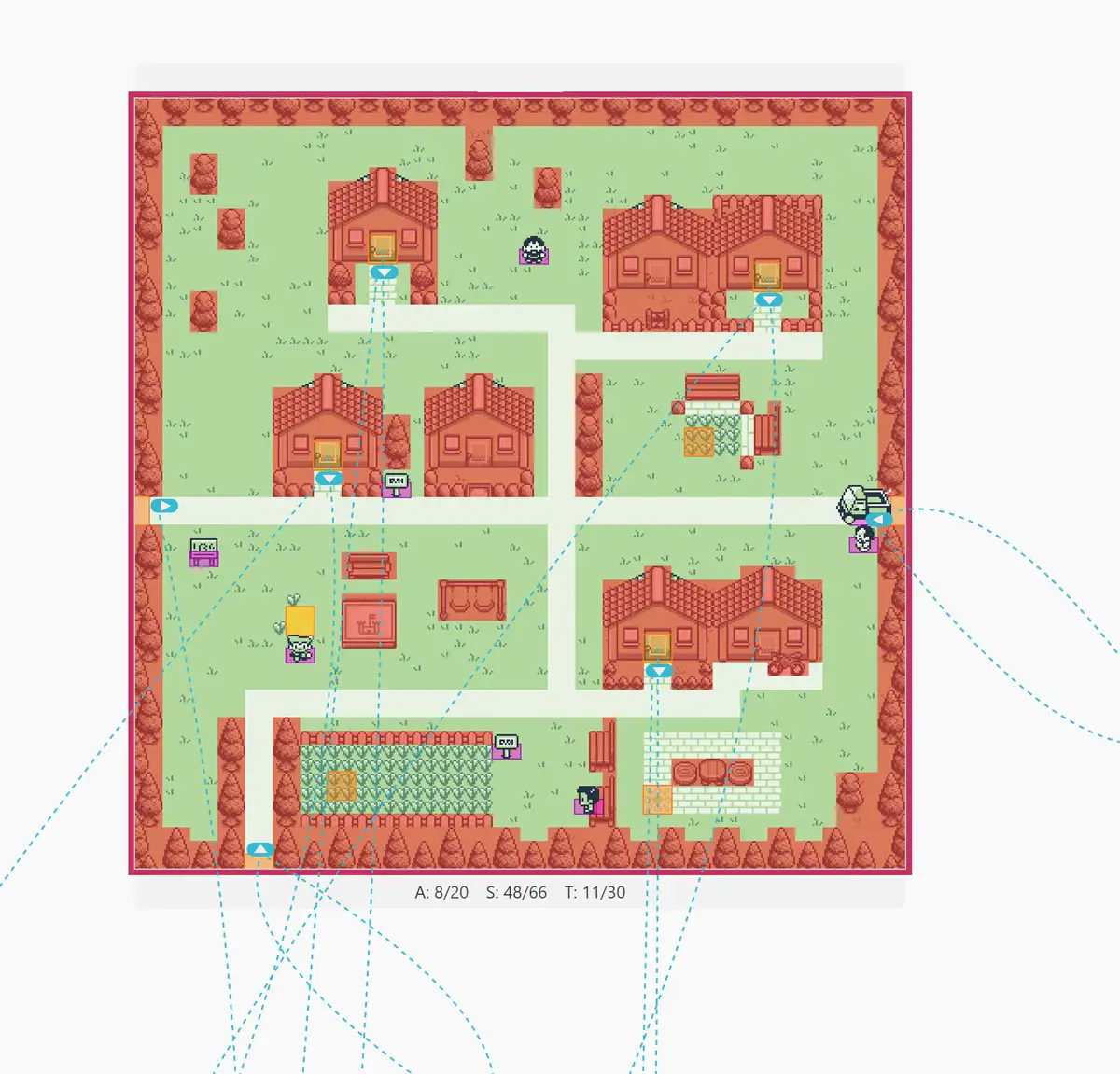 Solo dopo ho iniziato a popolare le aree con la grafica. Prati, case, strade, personaggi, tutti recuperati da pacchetti gratuiti disponibili su itch.io, realizzati da diversi utenti.
