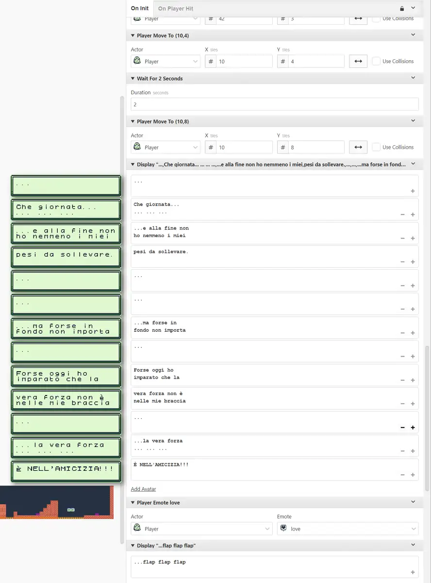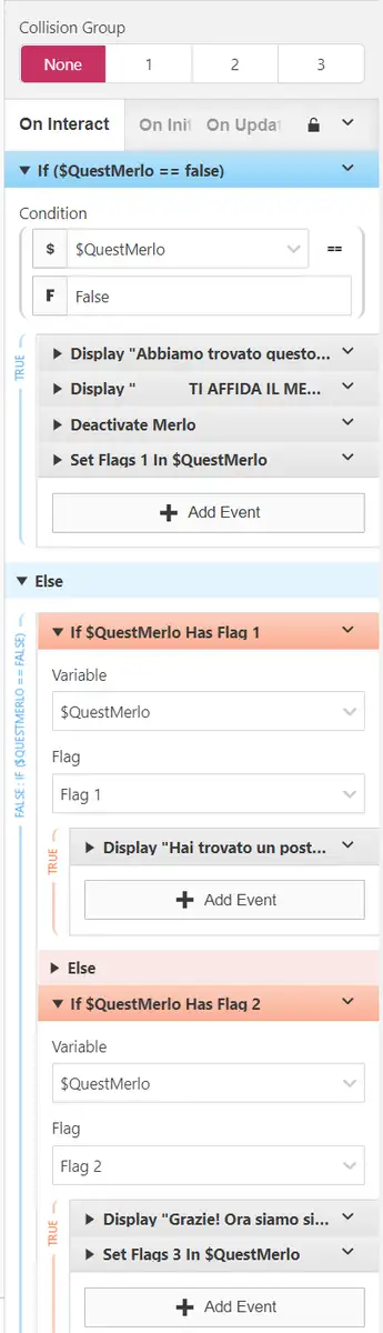 Questo a livello macroscopico, ma a livello microscopico bisogna pensare alla logica di ogni singola azione: ad esempio un personaggio che ha impostata una frase in cui chiede aiuto per qualcosa dovrà cambiare la frase in una di ringraziamento una volta che è stata svolta l’azione da lui richiesta.