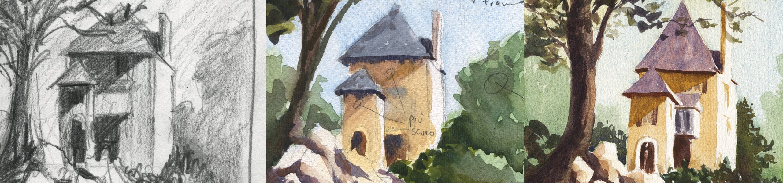 Il soggetto di questo dipinto è una casa sull’isola di Bréhat, in Bretagna. Ho cominciato con un piccolo studio a matita per definire la composizione e la distribuzione di luci, ombre e mezzitoni.