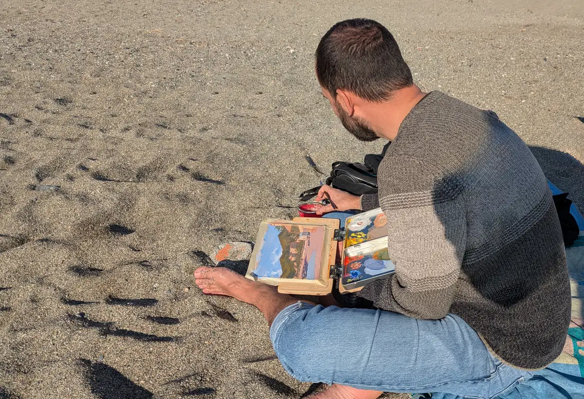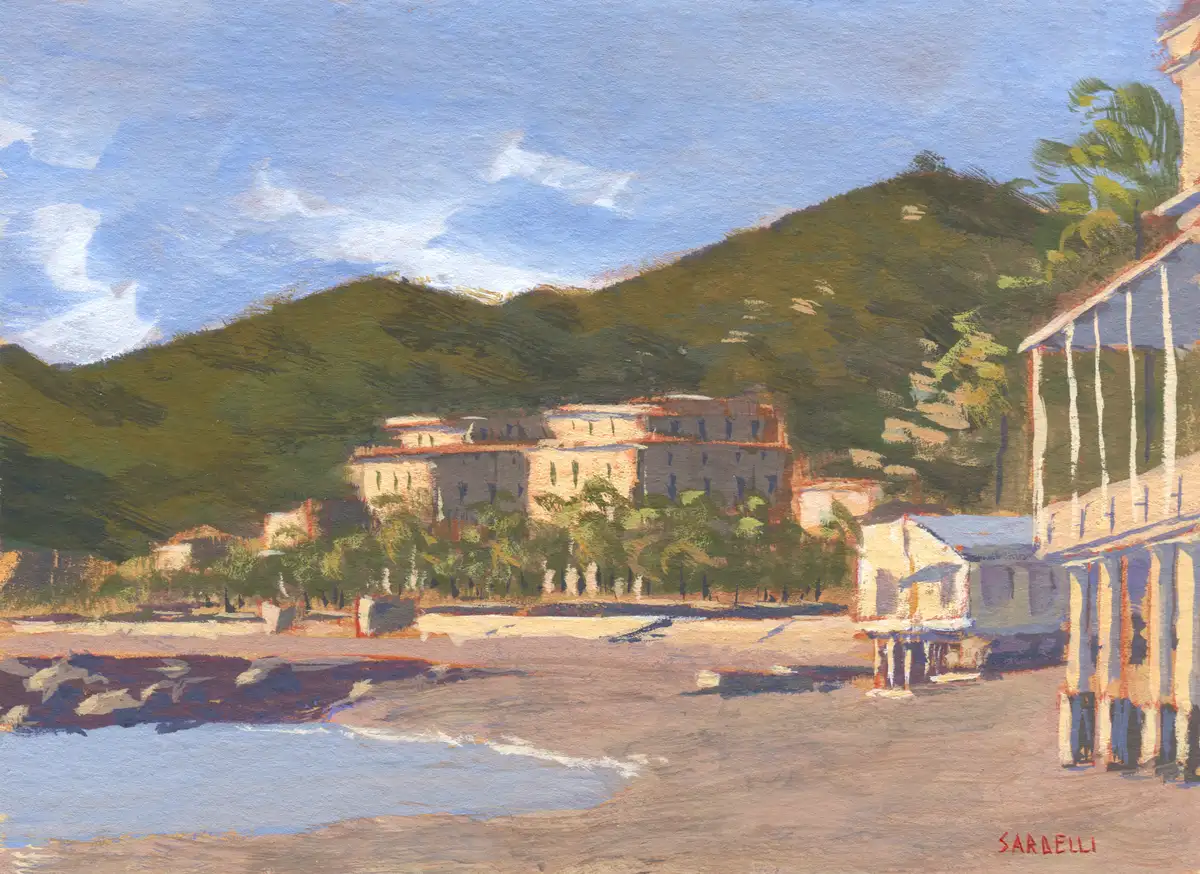 Ho cercato di cogliere la luce del sole invernale, che è molto basso anche nelle ore centrali della giornata e ha una luce diversa da quello estivo. La spiaggia era vuota, giusto qualche persona che passeggiava, e l’ho lasciata così anche nel dipinto. Chissà magari qualcuno riconosce questo posto.