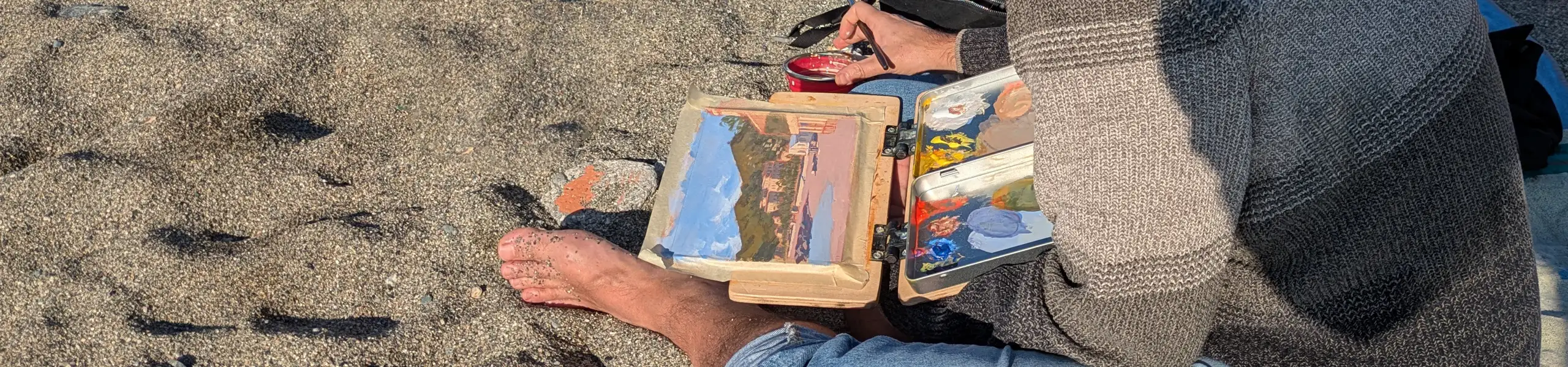 C’è un fascino particolare che ha il mare in inverno, con il letargo degli orrendi lidi la spiaggia diventa una distesa libera per tutti. Dato che c’è poco da fare, nonostante avessi portato il costume, che è rimasto nello zaino per codardia, ho avuto molto tempo per dipingere. Certo, tra un morso di focaccia e l’altro. Fortunatamente il mare lava l’unto dalle dita e il foglio non si macchia.