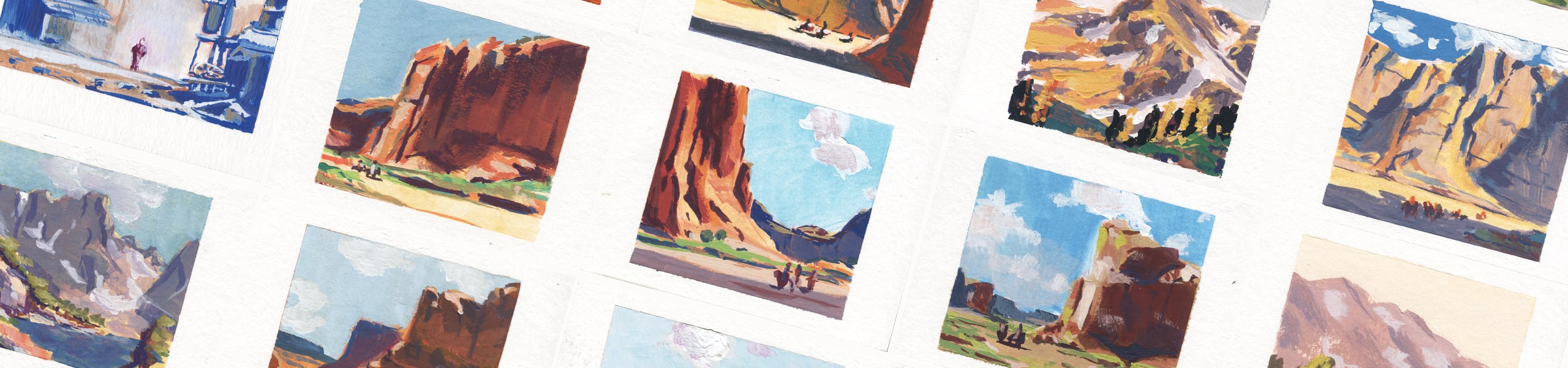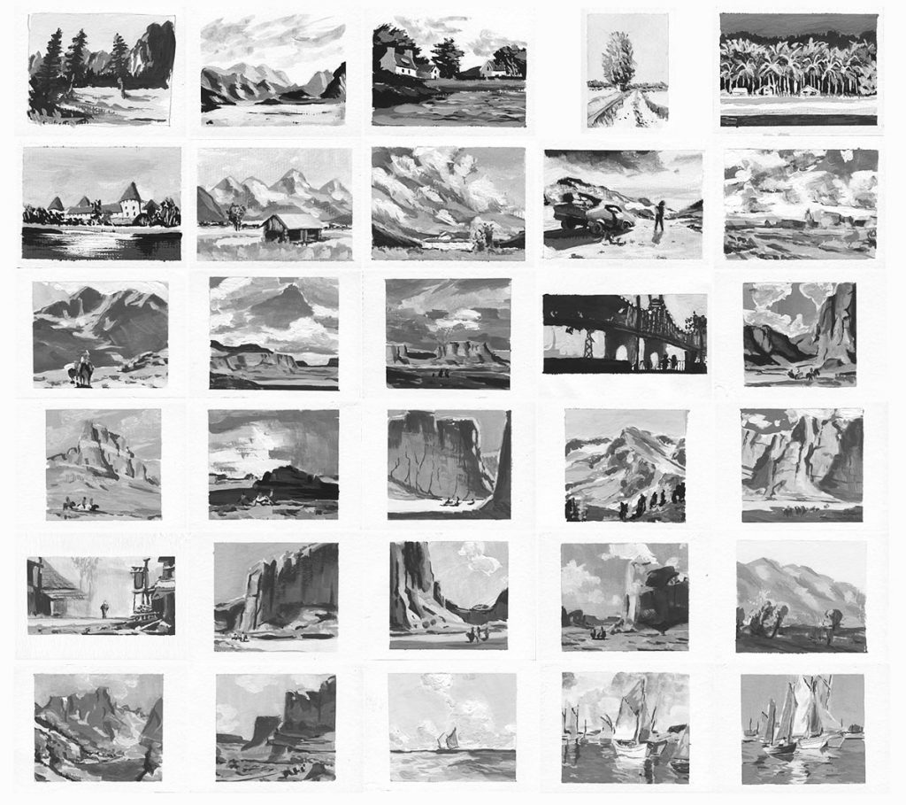 Poi sono passato a lavorare con il colore, concentrandomi sulla luminosità del colore stesso più che sulla tonalità. Ovviamente tutti quei meravigliosi paesaggi che vedete dalla terza riga in poi non sono farina del mio sacco, ma studi dei dipinti di Edgar Payne.
