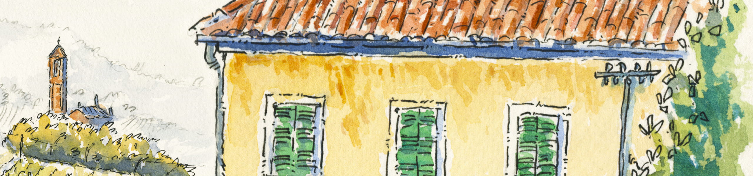 I colori della facciata e delle tegole si mescolano con le tinte autunnali dei vigneti, per cui si è subito candidata come soggetto perfetto per un disegno nell’attesa di ricevere i nostri calici di vino.